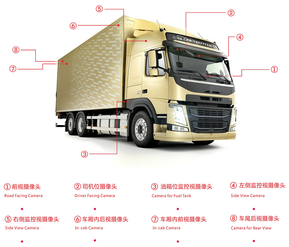攝像頭安裝位置(根據(jù)車型大小可選多路車廂監(jiān)控攝像頭):