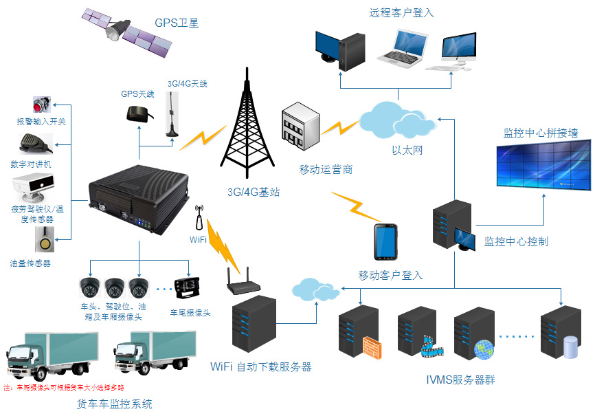 前端車載監(jiān)控系統(tǒng)是整個方案的重要組成部分,它是通過在車內(nèi)外安裝攝像頭采集音視頻數(shù)據(jù),實(shí)現(xiàn)安全無死角監(jiān)控;并利用GPS全球衛(wèi)星定位系統(tǒng)實(shí)現(xiàn)對車輛進(jìn)行實(shí)時定位;同時外接車載報警開關(guān),可實(shí)現(xiàn)相應(yīng)的報警提示(如:報警按鈕、剎車、門磁開關(guān)等);配置數(shù)字對講機(jī)后可實(shí)現(xiàn)平臺與單輛/多輛之間的對講;配備疲勞駕駛儀可監(jiān)控司機(jī)的疲勞狀態(tài),預(yù)防交通意外(冷鏈物流車配備溫度傳感器,可實(shí)時監(jiān)控車廂內(nèi)溫度);設(shè)備終端安裝油量傳感器后,監(jiān)控中心可及時得到油量異常報警,防止偷盜油事件。并通過車載MDVR主機(jī)對音視頻、GPS、報警數(shù)據(jù)進(jìn)行編碼、存儲及3G/4G無線網(wǎng)絡(luò)上報服務(wù)器,從而實(shí)現(xiàn)對車輛的遠(yuǎn)程監(jiān)控與管理。